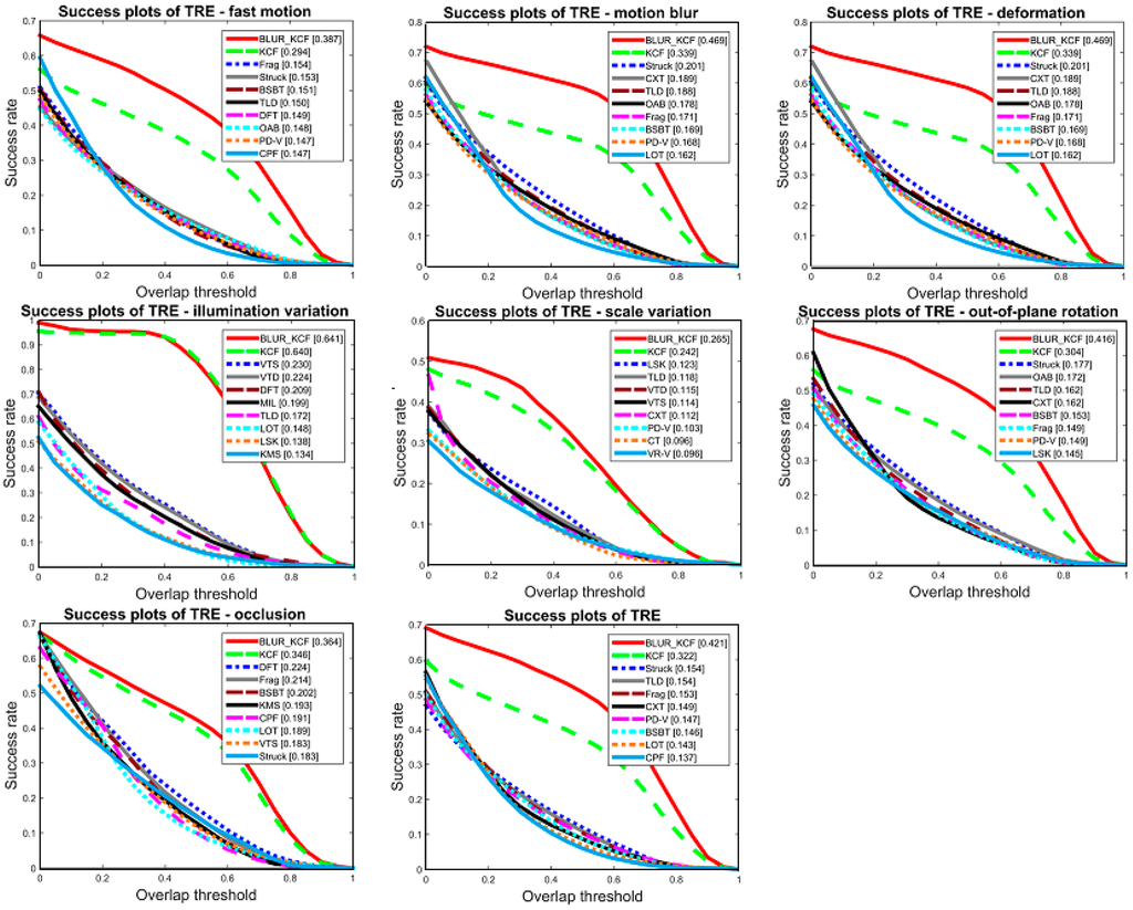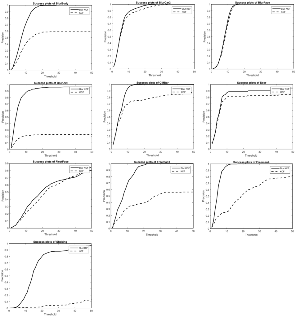 These figures show the success rate plot comparison among trackers. In Figure 4, we plot the precision rate comparison between our algorithm and KCF tracker. Precision plot shows the percentage of frames whose location error measured in Euclidean distance is within the corresponding threshold in the x-axis; whereas the success plot shows the percentage of frames whose accuracy measured with is within the overlap threshold. Additionally, our method has been tested with Matlab2014a on a PC, Intel corei5, 3.49 GHZ and 4 GB. Other improved KCF trackers like SAMF and part-based KCF take 5 times computation or more than KCF. Our tracker performs advantageously compared with these top trackers for sequences containing blur and fast motion that consumes not much computing.