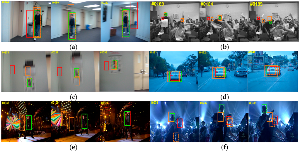 (a) BlurBody; (b) Freeman4; (c) BlurOwl; (d) BlurCar2; (e) Singer2; (f) Shaking. The results marked in orange, dashed orange, red and green are respectively from CXT, Struck, KCF and Ours.
