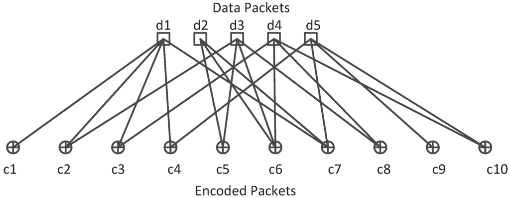 Fountain code is a class of erasure code and used for recovering lost packets in the erasure channel. The representative fountain codes are Luby transform (LT) codes [28] and Raptor codes by Shokrollahi et al. [29]. The basic idea of fountain codes can be described as follows : the sender divides the source file into K packets and encodes these packets into N packets (), anyone who wishes to receive the source data file collects the encoded packets until the number of received packets is a little larger than K, then the receiver can recover the original file with these packets. The advantage of fountain code scheme in a multicast system is that any node in the network can recover the original data packets with enough coded packets and the decoding process could be done in a linear time with high successful probability [28]. In addition, if each node encodes the data packets independently and randomly, the receiver can recover the original data packets with encoded packets from different sending nodes. In this way, the fountain code shares the same properties with network coding and can be treated as a particular class of network coding. A typical encoding process of LT codes is illustrated in Figure 2. There are 5 original data packets and 10 encoded packets in the Tanner graph. Each output encoded packet is the XOR of randomly selecting data packets. The number of original packets participating in an encoded packet relies on the design of output degree distribution . The decoding process of such codes can be performed in a simple way by belief propagation (BP) algorithm [30] as follows: