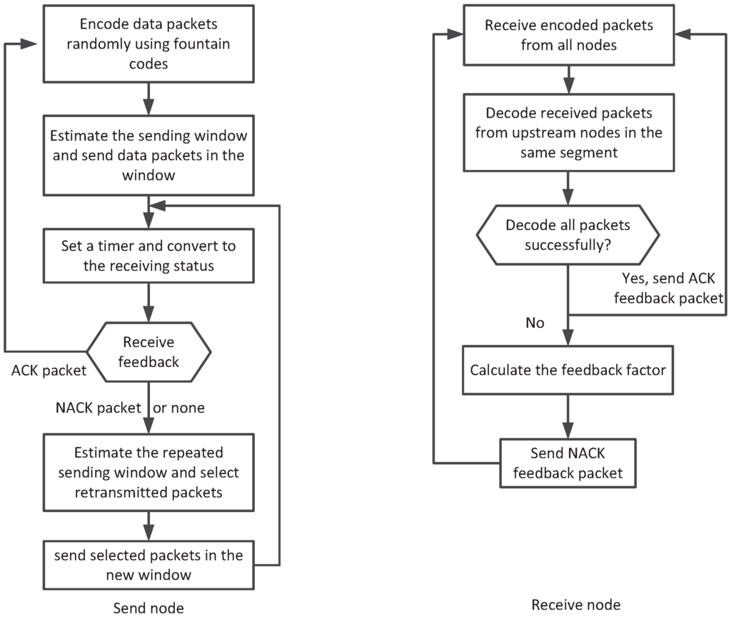 The overall process of NCHARQ protocol is illustrated in Figure 3. In NCHARQ, the source node first groups the original data packets into blocks, and each block contains K data packets. The original data packets K in a block size is set as a system parameter. The packets are sent hop by hop and block by block in the network. The sending nodes encode each block into N encoded packets with fountain code independently. Then, out of N encoded packets are selected randomly according to the window size estimation algorithm in node i, and the sender sends the encoded packets at one time. Then, it waits for the feedback from the adjacent downstream node to decide whether to send a new block or retransmit part of encoded packets in the previous block. The process of NCHARQ in sender and receiver is described in Table 1.