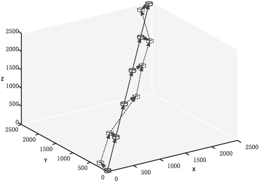 We assume the nodes are distributed in a cubic box of 2500 × 2500 × 2500 as shown in Figure 4. At the initial state (time 0), Node 0 (source node) is located at (0, 0, 0) and Node N (destination node) is located at (2500, 2500, 2500). Thus, the total transmission range is about 4.33 km. The relay nodes are distributed uniformly in a straight line between Node 0 and Node N. All the nodes in the network can move randomly within their mobility range. Thus, the packet error rate changes randomly with time passing by. We choose a relatively small data packet size (50 Bytes) and original data packet number (100) in one block here, so our parameters can adapt to a high-dynamic underwater environment.