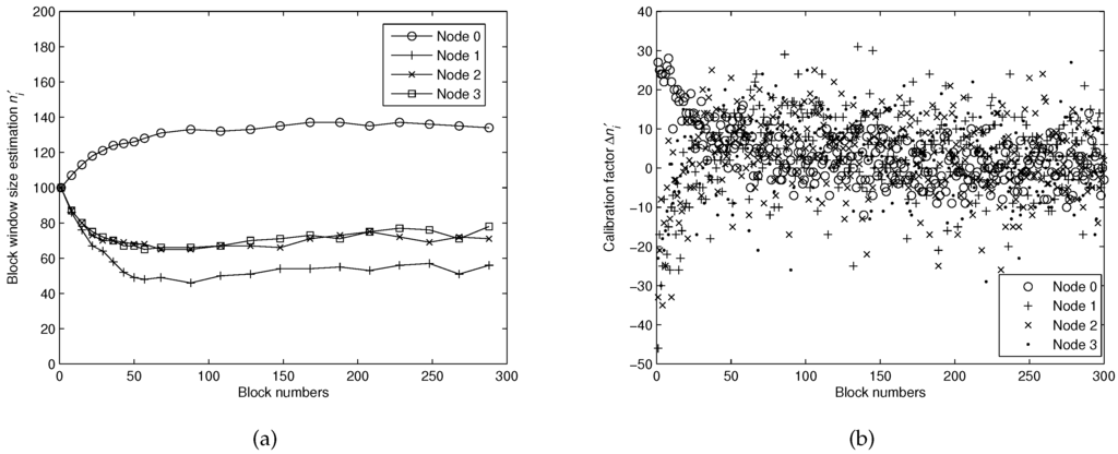 (a) the convergence procedure of estimating the block window size for different nodes; (b) the calibration factor for different nodes.