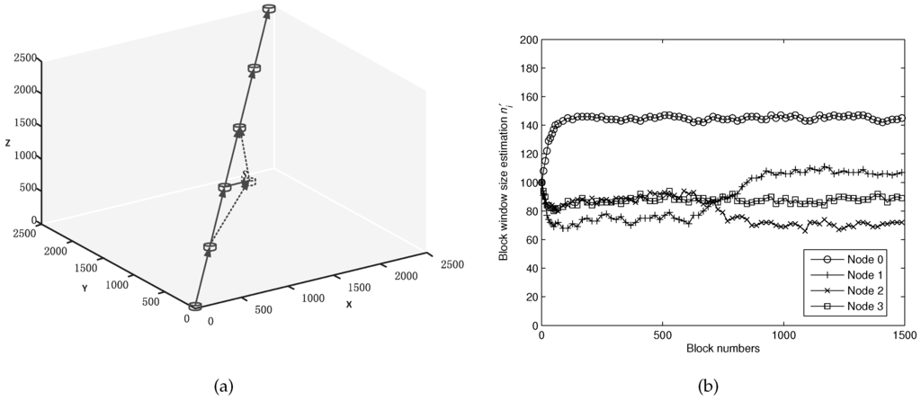 (a) an illustration for movement path; (b) the convergence procedure of estimating the block window size for moving nodes.