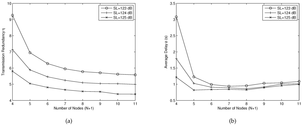 (a) the transmission redundancy η for different transmitting sound level ; (b) the average delay ϕ for different transmitting sound level .