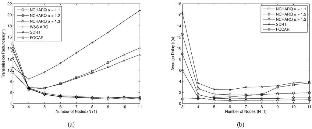 Figure 8 shows the performance of SDRT, SDRT, FOCAR, S&W ARQ and NCHARQ protocol. We consider a practical and dynamic scene to conduct our simulations here. We assume that all nodes in the network can move with water flow at the speed of 0–1 m/s. Each node can move in any direction and the structure of the network will change largely with the flow of times. The node distribution is the same as Section 5.3 at the initial state. From Figure 8a, we can see clearly that our proposed protocol NCHARQ can achieve lower transmission redundancy with the help of nodes cooperation, so the improved system can achieve a low energy consumption. When the number of nodes is small (), the distance between adjacent nodes is very long and the transmission links suffer from large packet loss rate. However, for non-cooperative schemes, the increased number of hops may result in a larger number of transmission redundancies because each node has to send a large number of packets to its adjacent downstream node and the node cannot utilize the information from other nodes in the network. For NCHARQ, with the help of all nodes in the network, the transmission redundancy can be much lower when the number of nodes is sufficient. We can save about or more sent packets compared with other protocols when . The redundancy factor α does not have a pronounced impact on the performance, but is advisable for it achieves the least η in the simulation. Figure 8b shows the average delay ϕ for different protocols. When the number of nodes is small, it will be unlikely for nodes to receive packets from other nodes except for the adjacent one. Thus, the network coding will be almost useless and it may be not advisable to use NCHARQ in such a scene. The packet error rate between adjacent nodes is very large ( for ) in this situation, and thus it is suggested to add more nodes to the network to achieve high reliability. It can be seen clearly that our proposed protocol NCHARQ with and achieves the lowest average delay compared with SDRT and FOCAR as the number of nodes increases. For wait and stop ARQ, the average delay is too large ( s) and is not drawn in the figure. The average delay can be as low as 0.53 s for sending a data packet successfully when , which saves at least of the transmission time compared with the other protocols.
