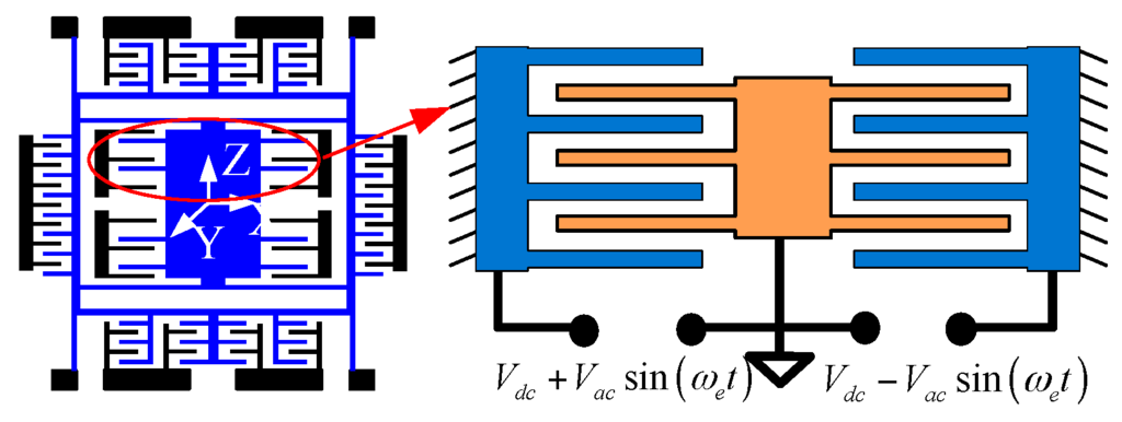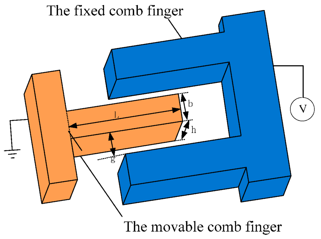Among it, represents direct voltage; refers to altering voltage; stands for excitation frequency, N represents the number of comb fingers.