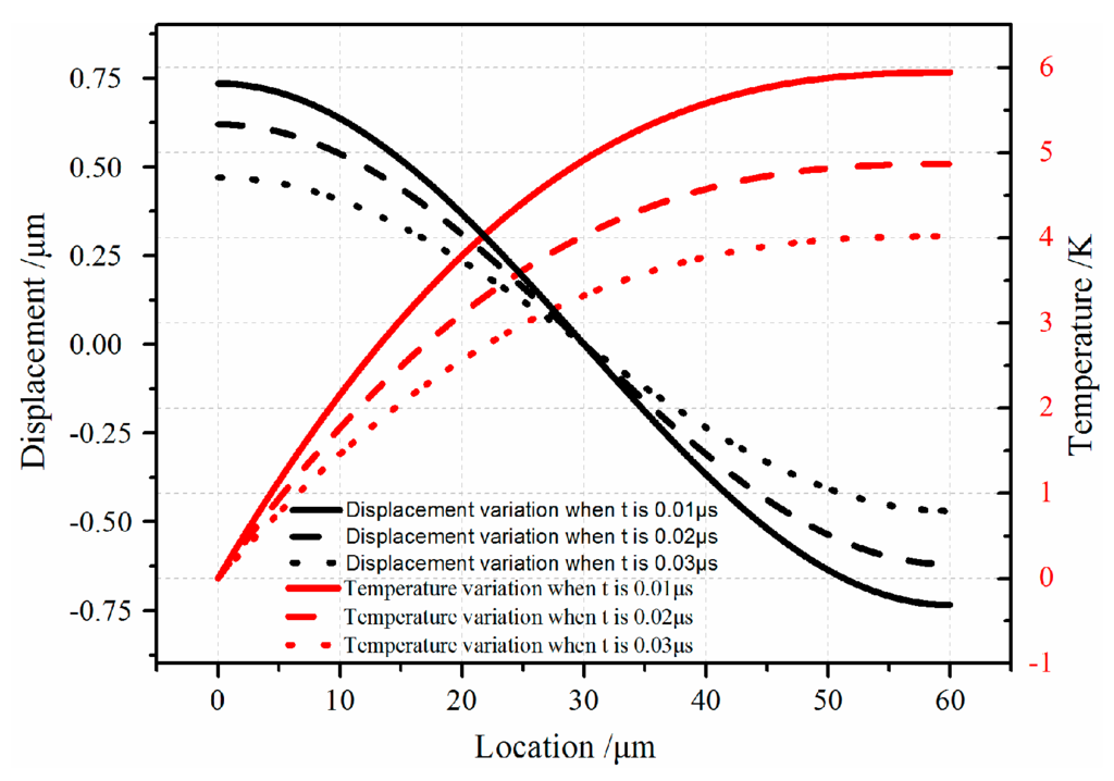 The defined Riemann-sum approximation method in Equation (18) is used to perform the numerical inverse Laplace transform. The vibration displacement and temperature that generate during the vibration process are obtained. Figure 3 indicates the dynamic displacement and temperature of the micro-resonator for the coupled thermoelastic case. It can be observed in Figure 3 that the displacement u reaches maximum value both in two ends to satisfy the boundary Equation (8). Also, it can be seen from inverse Laplace transform that the vibration of the movable comb finger decays with time increasing when the coupling between strain and thermal fields are taken into account. Also the temperature decreases with the time increasing which means the mechanical energy of resonator is dissipated in the form of thermal energy. From the relationship between vibration displacement and temperature, it can be concluded that the temperature increases with vibration strength. When the resonator vibrates at drive-mode with electrostatic load, the variation of temperature is more severe.