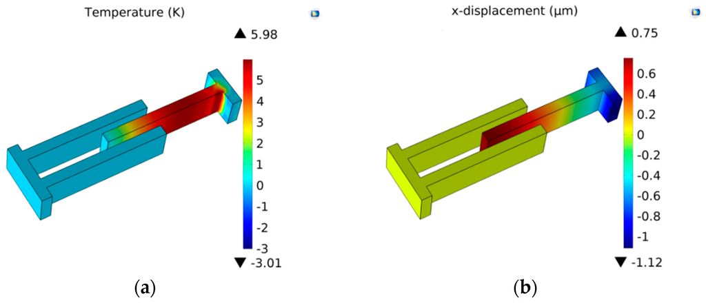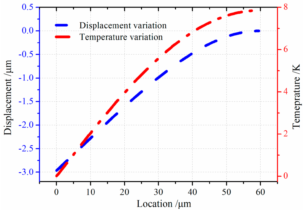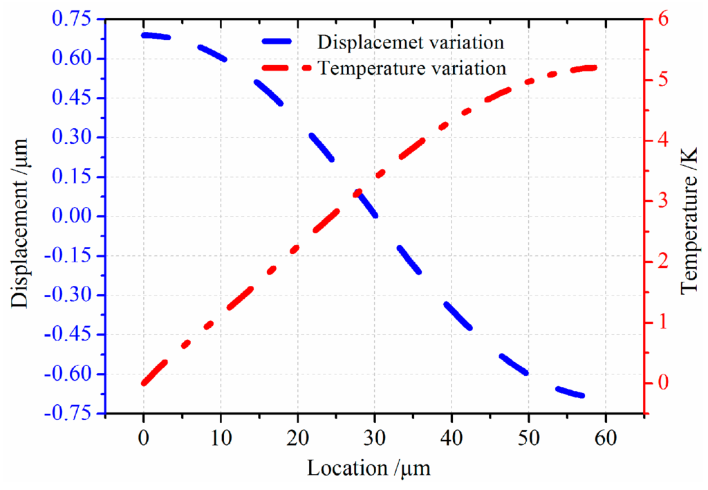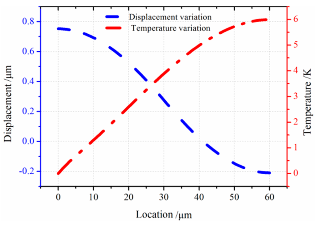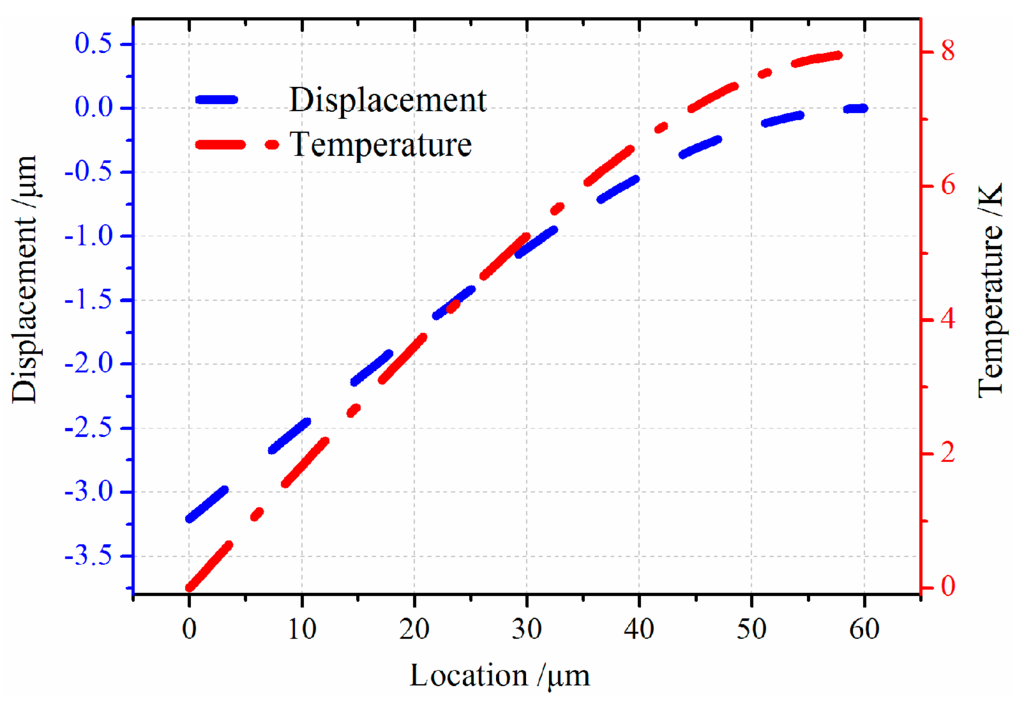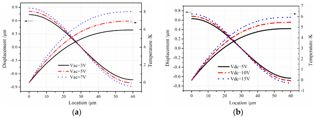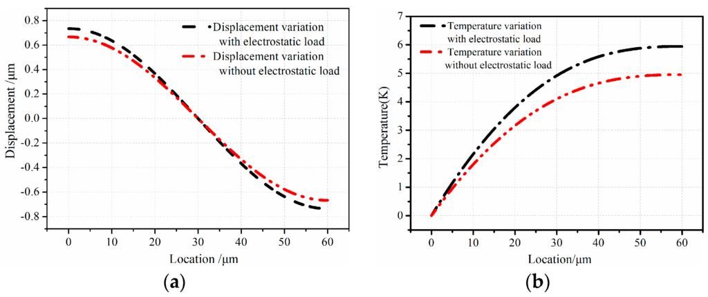 In order to measure the effect of electrostatic load on the thermal and vibration couple process, the vibration with electrostatic load and without load is compared. The results are graphically presented in Figure 5. Note that the longitudinal free vibration moves around the first resonance frequency. From Figure 5, there is a quite obvious difference in the displacement under two different conditions. The discrepancy is about 0.1 µm in displacement, and the temperature variation shows 1.0 K difference. From the results, the thermoelastic coupling strength of micro-comb fingers with electrostatic load is stronger than that without electrostatic load.