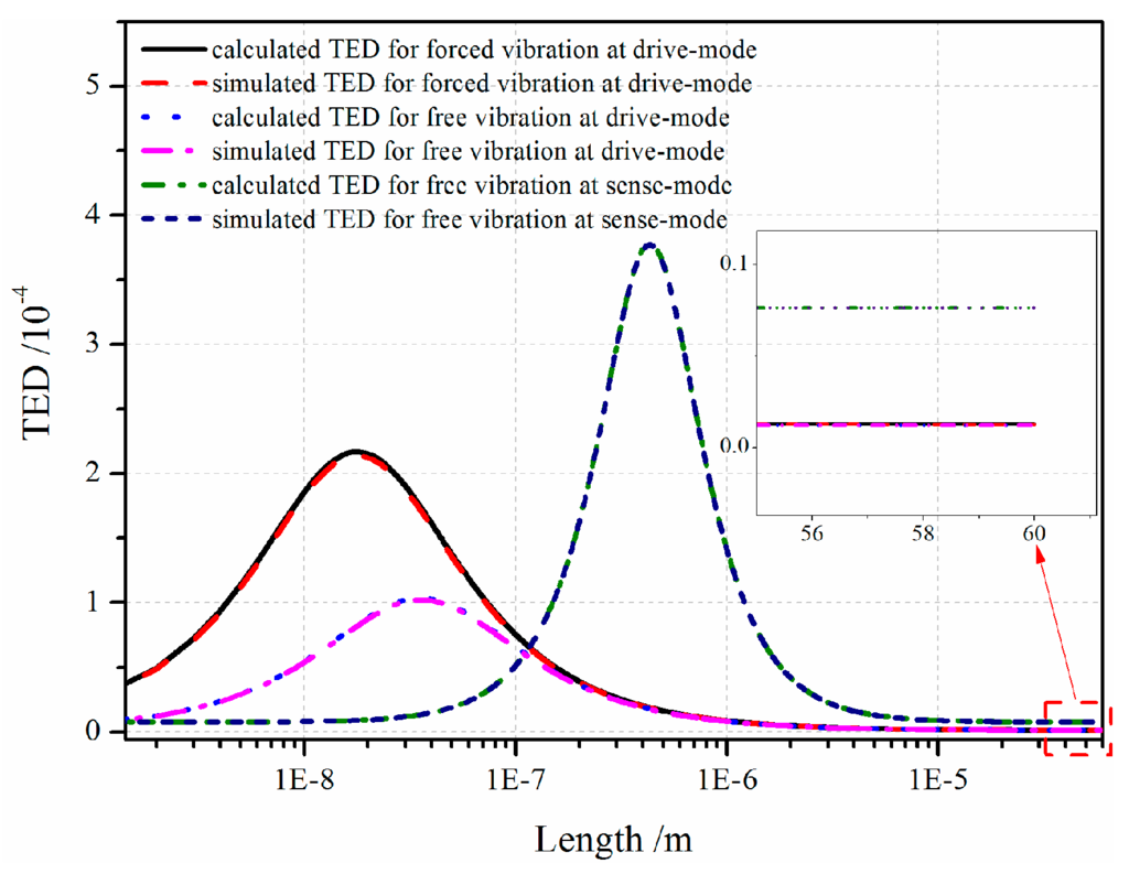where and are the stress and strain under vibration process. On account of inverse Laplace transformation of s domain to time domain, the dependence of TED on resonator material and geometry dimension is deduced. It is difficult to find the inverse Laplace transformation in the Laplace domain analytically, so the numerical results for different conditions are plotted in Figure 13. The results show that as the resonator length increases, the TED first increases and then decreases. Furthermore, there exists a critical size at which TED takes the maximum value. It is shown that under different vibration modes, the TED reaches different peak values. TED for electrostatic-actuated vibration at drive-mode is larger than that for free vibration, and TED of resonator vibration at sense-mode is larger than that at drive-mode. For the movable comb resonator with 60 µm length, TED at drive-mode of electrostatic-forced vibration and free vibration and sense-mode vibration is 1.278 × 10−6, 1.212 × 10−6, 7.662 × 10−6 and the maximum TED value with critical size is 1.9 × 10−8 m, 3.6 × 10−8 m, 4.3 × 10−7 m, respectively.