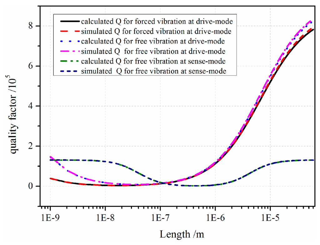 From the comparison results in Figure 15, the simulated Q values are about 10% smaller than the results from Equation (36). According to Xu, the sum of electronics damping and anchor loss is about 20% of measured Q. The electronics damping is not considered in the simulation process, so the simulated Q value is a little smaller than the calculated value. The analytical solution coincides with the calculated results from Equation (36). The analytical conclusions are thus experimentally verified.