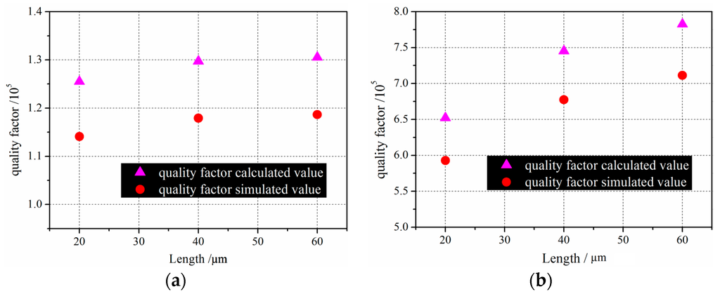 From Xu’s results, the TED for a whole device is the dominant loss in the drive-mode and sense-mode of the tuning-fork structure, occupying as high as 76% of the total energy loss. The comb finger parameters are substituted to the Q expression in Xu’s experimental research, which can obtain the relationship between Q and resonator length. The comparison was made between the simulated results of comb finger and the calculated results from Equation (36).