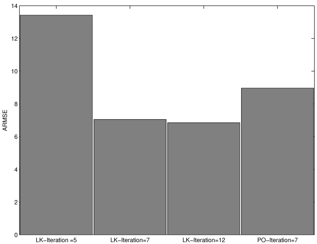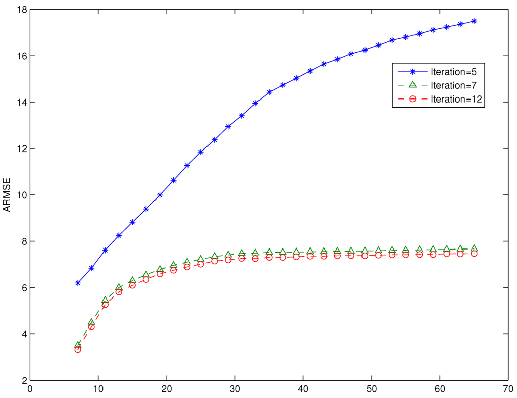 In the third experiment, we explored the effect of varying the number of iterations of the consensus filter based algorithm. We run the consensus filter based algorithm with particle size , and the number of iterations of 5, 7 and 12. The performance, in terms of RMSE, of the proposed consensus filter based algorithm as the number of iterations of the consensus filter is varied and plotted in Figure 4. A similar plot of ARMSE versus the number of iterations is shown Figure 5. In Figure 5, we have also included the plot of the ARMSE for an iteration of 12. As seen from both figures, the performance improves significantly as the number of iterations is increased from 5 to 7; however, as the number of iterations is increased from seven to 12, there is minimal performance gain. We also note that our algorithm outperforms the algorithm based on a Gaussian approximated posterior for the same number of iterations (iterations = 7). The plots denoted by represent the results from our proposed algorithm, while the plot denoted by represented the result from the algorithm based on Gaussian approximated posterior.