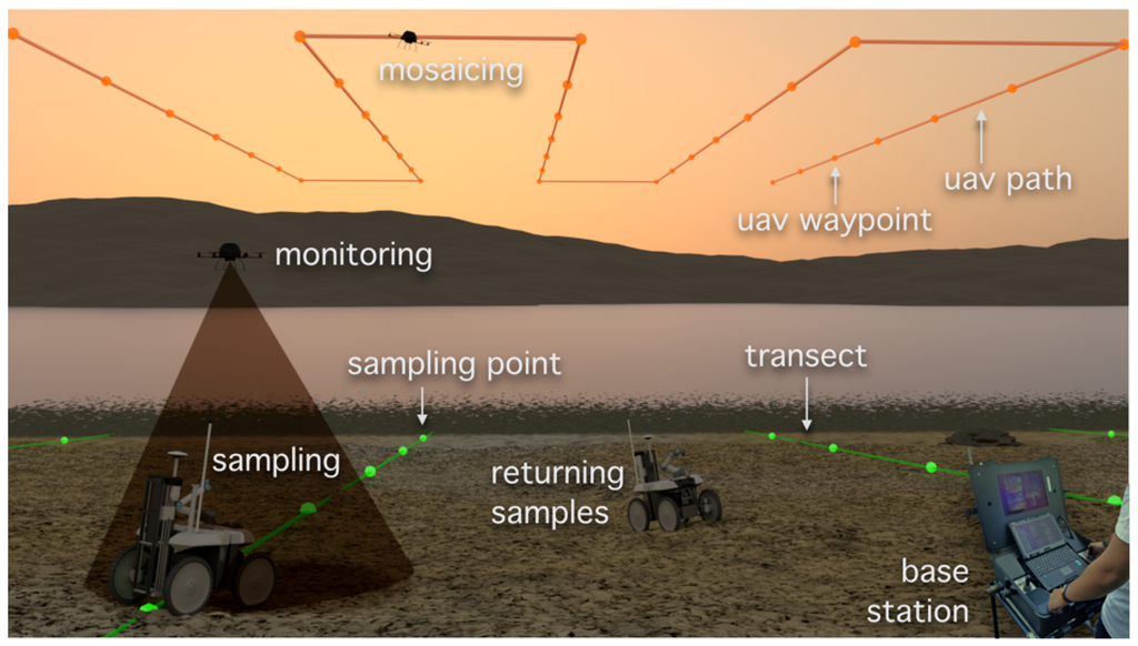 - With the information collected in the previous step, the ground vehicle is tele-operated by the expert so as to traverse the transects and periodically sample the terrain while avoiding any peril in its way. At each sampling point, the expert requests the ground vehicle to perform a sediment sampling behavior. If intended by the expert, the aerial vehicle is used to provide aerial images, augmenting the operator’s perception about the mission execution.