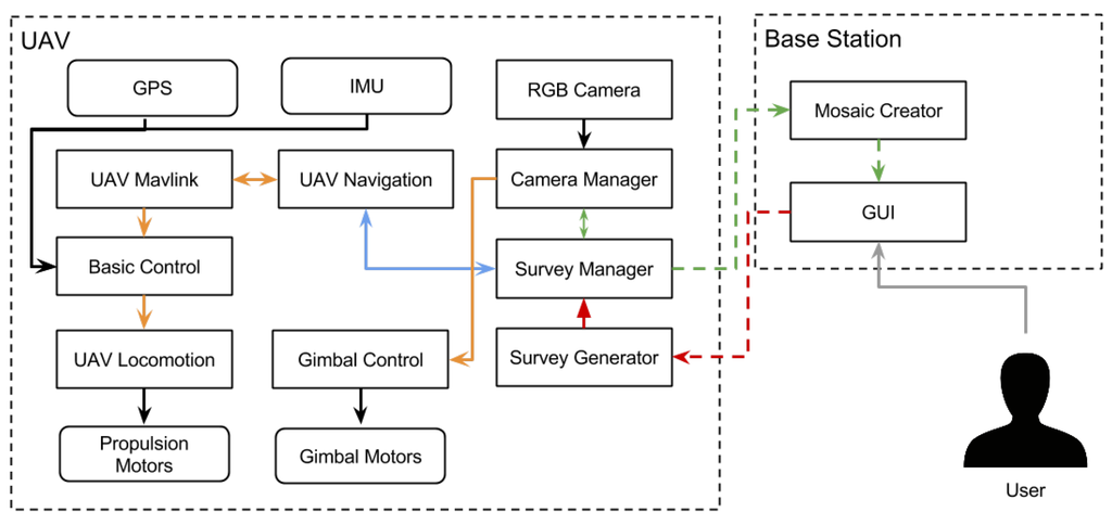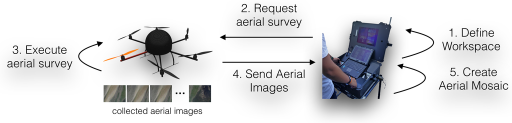 - The aerial robot takes off and performs a scan to cover the workspace defined by the expert. As a result of these scanning procedure, the UAV builds a high resolution geo-referenced mosaic from a set of mutually-registered aerial images. The mosaic is then presented to the expert, which is now able to discard the satellite imagery, as it is most likely outdated.