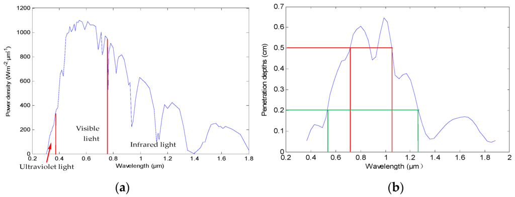 (a) The curve of power density of the earth surface; (b) The penetration depths in skin tissue of the light corresponding to 0.40–1.80 μm.