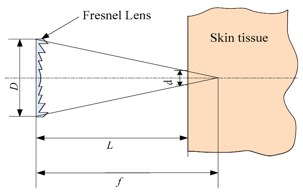 Generally, the energy density of solar radiation is relatively low in the morning, evening, and on a cloudy day. To provide enough energy for the implantable biosensors, the solar radiation is gathered through a Fresnel lens in the proposed method. Moreover, the application of Fresnel lens also can decrease the size of a sunlight spot, which is helpful to reduce the photosensitive surface of the implantable cell. Additionally, a Fresnel lens with flat form is suitable for the wearable applications. Figure 3 shows the parameters of the Fresnel lens, in which D represents the aperture, d is the spot diameter on the skin surface, f is the focal length, and L is the distance between skin and Fresnel lens. According to the geometrical optics theory, the spot area (Sr) of sunlight on the skin surface can be expressed by Equation (3). Additionally, the use of a Fresnel lens does not introduce a safety issue, which is discussed in Section 3.1.4.