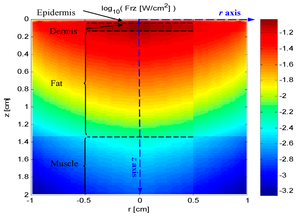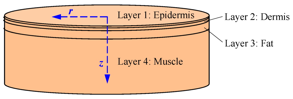 The skin tissue of human body was modeled geometrically by four infinitely wide layers, which include epidermis, dermis, fat, and muscle as shown in Figure 4. The thicknesses of the epidermis, dermis, and fat layers are 0.0065 cm, 0.125 cm, and 1.2 cm, respectively [23,24]. Meanwhile, the thickness of muscle is set to infinity because sunlight generally cannot penetrate the muscle layer. Moreover, in the cylindrical coordinates of the developed model shown in Figure 4, the r axis plane is parallel to the tissue surfaces, while the z-axis is perpendicular to the skin surfaces.
