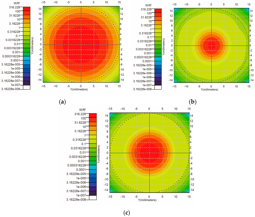 The transmissions of sunlight in the air and Fresnel lens were simulated by using TracePro software. According to Equation (3), if d = 2.00 cm, L = 0.53 cm. Figure 5 shows the vertical incidence results corresponding to the cases that L = 0.53 cm as well as L = f = 1.60 cm and L = 2.10 cm (f + 0.50 cm). According to Figure 5, the results corresponding to the cases that L = 0.53 cm has a comparatively big spot area with high luminous flux, which is helpful to achieve more electric energy. Therefore, in our simulations, L is set as 0.53 cm.