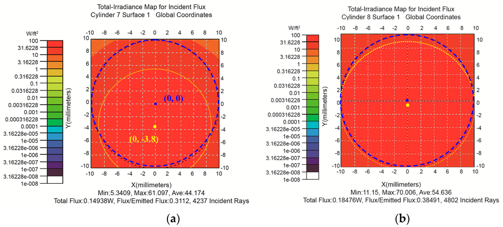 According to the altitude angle, azimuth angle and incident energy in different times, the energy distribution of the skin surface after the Fresnel lens can be obtained, as shown in Table 2. Figure 6a shows the energy distribution corresponding to 12:00, in which the point (0, −3.8) is the center of luminous fluxes distribution on skin surface, while the point (0, 0) represents the center position of implantable photovoltaic cell in the plane vertical to the optical axis. It can be found from Figure 6a that the center of luminous fluxes distributions is generally located at the lower of the center position of implantable photovoltaic cell. Therefore, in order to achieve more electric energy, the optical axis of the Fresnel lens was shifted by 0.50 cm in our following simulations. Therefore, it was close to the center of implantable photovoltaic cell, as shown in Figure 6b. As a result, the energies corresponding to 10:00, 12:00 and 14:00 were increased to 1.6 times, 1.4 times and 1.7 times of the previous energies, as shown in Table 2.