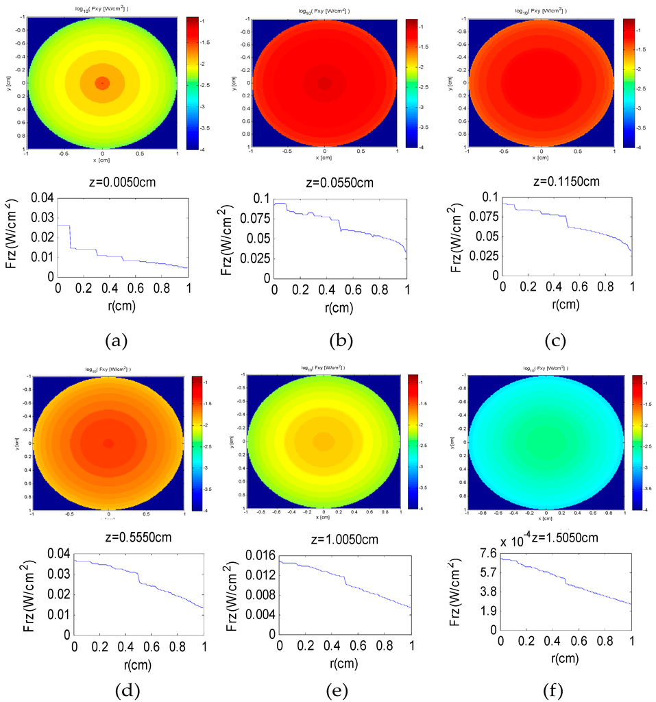 Figure 8 shows the longitudinal section of the energy distributions, of which horizontal axis represents r axis, and vertical axis represents z axis with the depth of 2.00 cm. According to Figure 8, the luminous fluxes are symmetric along the z axis. At the same time, the comparatively high luminous fluxes mainly focus on the symmetry area with 0.50 cm radius and 1.00 cm depth. Moreover, the luminous fluxes gradually decrease from 0.077 W/cm2 to 0.015 W/cm2 as the depth increases from 0.10 cm to 1.00 cm. Additionally, the energy (E) at the depth of D with the radius of R can be calculated by Equation (4).