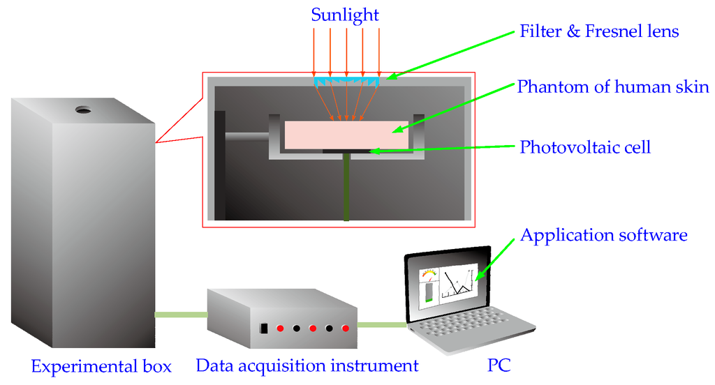 Our experimental device is shown in Figure 9, which consists of a filter (bandwidth: 0.50–1.00 μm), a Fresnel lens (D = 3.00 cm, f = 1.60 cm), a photovoltaic cell (photoelectric conversion efficiency: 16%, photosensitive surface: 2.00 cm × 2.00 cm, spectral response range: 0.40–1.10 μm, operating current: <200 mA and short circuit current: <±0.5%), a data acquisition instrument (sampling precision: 12 bit), a PC with the data storage and display application software (LabView, National Instruments, Austin, TX, USA). In this experiment, the photovoltaic cell is directly connected to the data acquisition instrument (in practical application of the proposed method, a charging circuit will be needed). Because pig’s skin and human skin are similar in both physiological characteristics and physiological structure [27], pork is suitable for the phantoms of human body. On the other hand, the layer thickness of pork skin is different from that of human skin. Moreover, it is generally difficult to measure the thickness accurately. Therefore, only the fat tissues of pork with different thicknesses (0.1 cm, 0.2 cm, 0.4 cm, 0.6 cm, 0.8 cm and 1.0 cm) were used in our experiments.