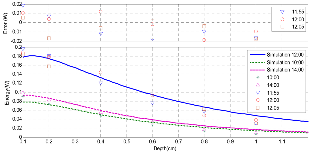 In order to verify the proposed method, the physical experiments of the recharging implantable biosensors based on solar radiation were carried out at 10:00, 12:00 and 14:00 of a day near summer solstice in Beijing, China, while the solar zenith angle is 73.53°, the solar azimuth is 0° [28] and the energy of solar radiation on the surface of the earth is 0.0679 W/cm2. Meanwhile, the corresponding simulations were also carried out by using the same parameters setting with the physical experiments, and the energies of the different depths were calculated using the method described in Section 3.2.3. Additionally, due to the fact that the optical characteristics of pork will change after 24 h [29], physical experiment was not carried out in more than one day. Figure 10 shows the physical experimental results and corresponding simulation results, of which the horizontal axis represents the thickness of the fat tissues, while vertical axis represents the achieved energy. In order to compare with the simulation results, which are the energies before the photoelectric conversion of the photovoltaic cell, the measurement results shown in Figure 10 are the results of the experimental device divided by the photoelectric conversion efficiency of the photovoltaic cell. In Figure 10, the experimental result of 12:00 is represented as the results corresponding to the times of 11:55, 12:00 and 12:05, respectively. Meanwhile, an error bar which shows the differences between the three experimental results and the simulation result is also provided.