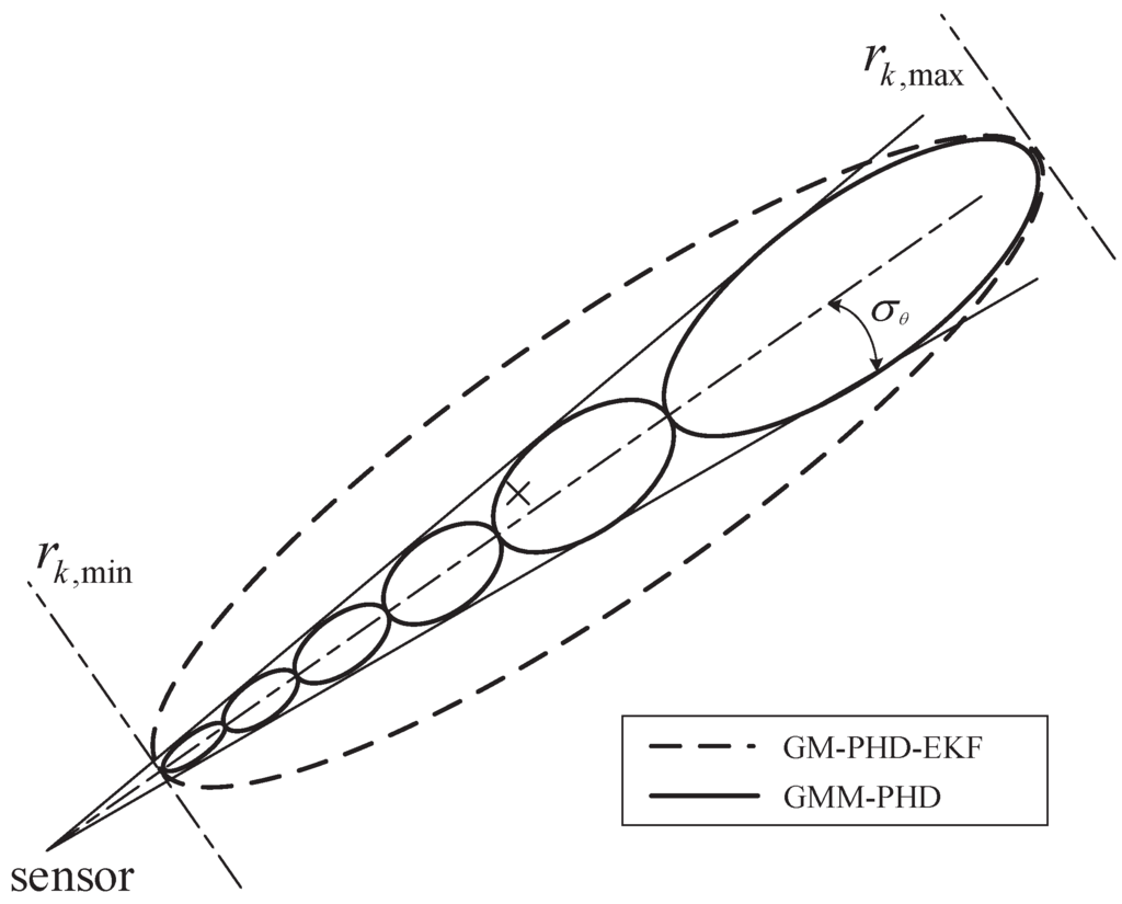 Figure 1 gives an example of the GMM presentation. In the figure, the measurement uncertainty of the GMM-PHD is approximated by six measurement components (shown as the solid ellipses), and that of the GM-PHD-EKF is modeled by a single Gaussian distribution (shown as the dashed ellipse). Actually, the measurement uncertainty of the GM-PHD-UKF is also approximated by one Gaussian distribution. The true target is displayed by a cross. It is obvious that the measurement likelihood function approximated using Gaussian mixtures in the GMM-PHD is much more accurate than the approximation with one Gaussian in the GM-PHD-EKF. Thus, the GMM-PHD can perform with a much higher tracking accuracy than the GM-PHD-EKF and the GM-PHD-UKF.