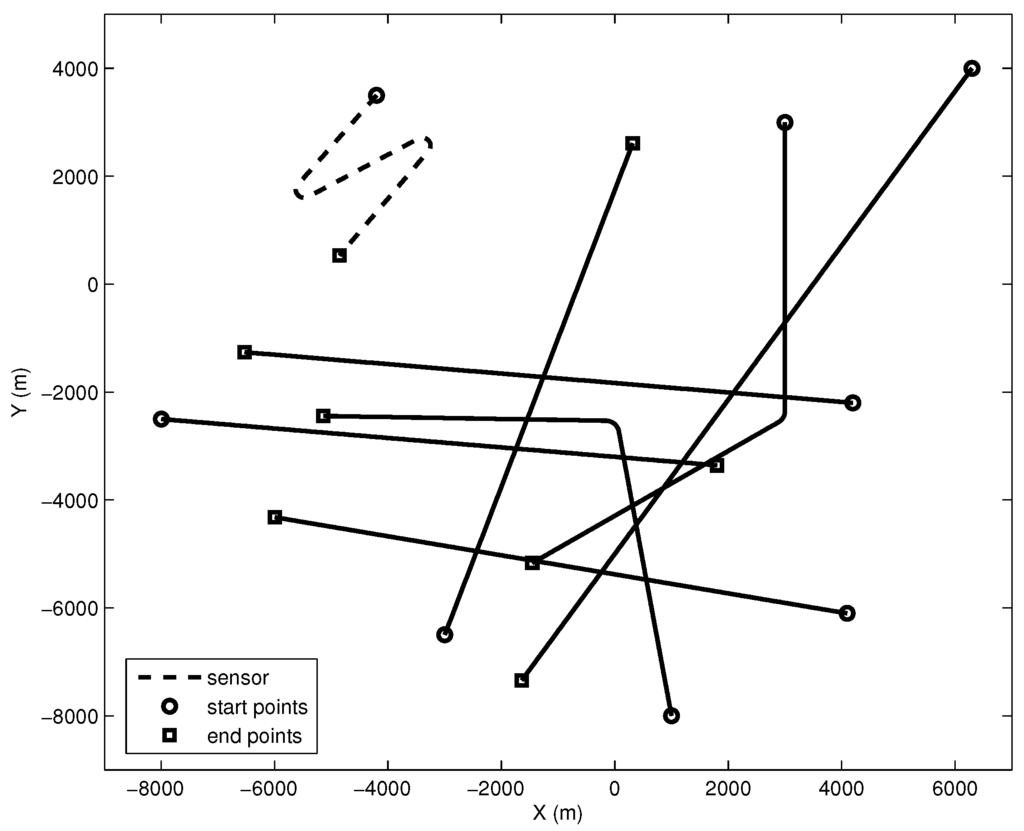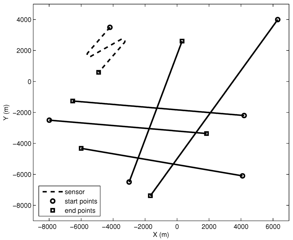 In this case, two maneuvering Targets are added to Case 1. The starting positions of Targets are and , respectively. The course of Target is changed from to at 25 min. The initial course of Target is and changes to at 28 min. The survival times of Targets are and , respectively. The speed of two targets is eight knots. The other parameters of Case 4 are also the same as those of Case 1. An illustration of the sensor and the targets without process noise and clutter in Case 4 is presented in Figure 4.