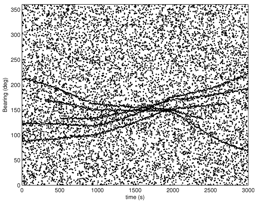 Bearings-only multi-target tracking (MTT) [,,] with clutter and missed detections is a challenging nonlinear problem. The filter for such a problem should not only deal with the nonlinearity of measurements, but also solve the measurement origin uncertainty of multiple targets. Bearings-only measurements [] are often obtained by passive sensors, such as sonars, and contain a low level of information about detected targets, leading to the observability problem []. For bearings-only single-target tracking, the observable level can be evaluated by the Cramer–Rao lower bound (CRLB) [,]. However, it is difficult to evaluate the level of observability in a theoretical context for the bearings-only multi-target tracking with clutter and missed detections []. In order to overcome the non-observable problem, the sensor needs to outmaneuver the targets [,]. As the origin of a measurement is not known for target tracking in clutter, the tracking filter needs to have a proper track-to-measurement-association method [] or something equivalent, such as symmetric measurement equations [] and random finite sets [].