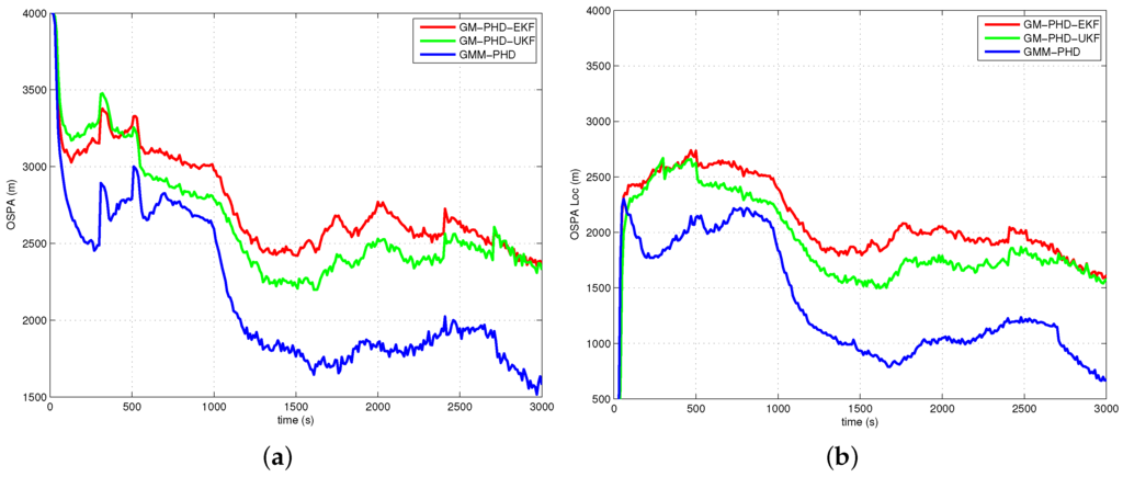 In Figure 5b, Figure 6b, Figure 7b and Figure 8b, the OSPA localization of the GMM-PHD is much lower than those of the GM-PHD-EKF and the GM-PHD-UKF after the target states become observable. Especially in Case 4, which contains two maneuver targets, the OSPA localization errors of the GM-PHD-EKF and the GM-PHD-UKF have significant increases after target maneuvering, as shown in Figure 8b. However, the proposed GMM-PHD can keep a high tracking accuracy as the likelihood function is modeled by Gaussian mixtures, which can quickly responds to the target course change. The performance of the GM-PHD-UKF is also better than the GM-PHD-EKF on the OSPA localization metric in all cases.