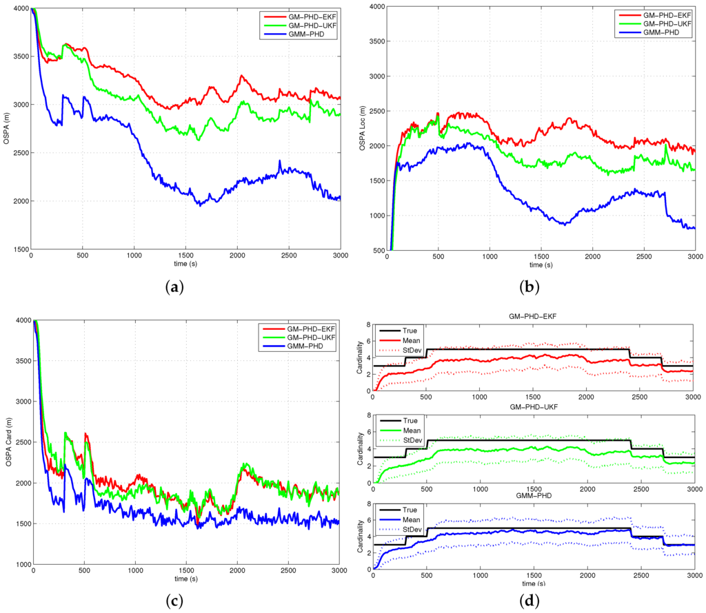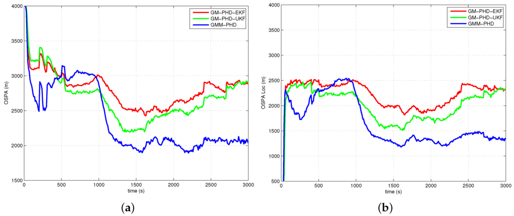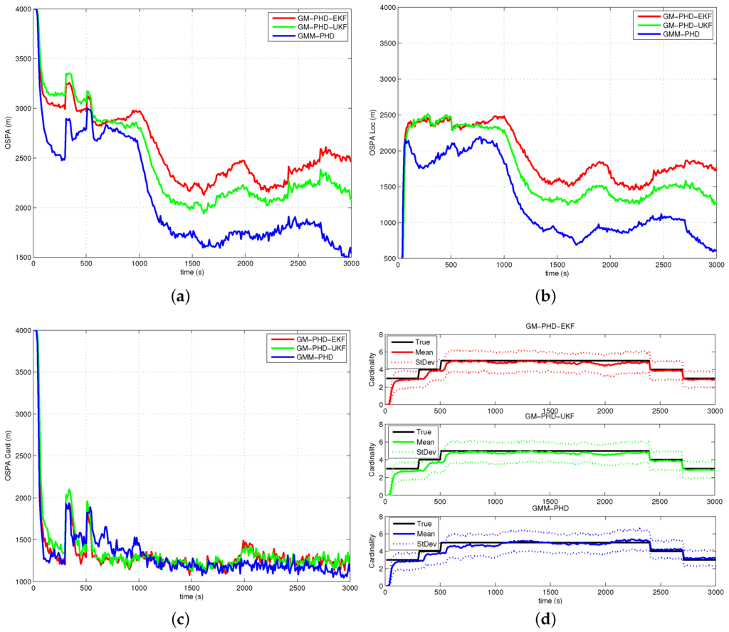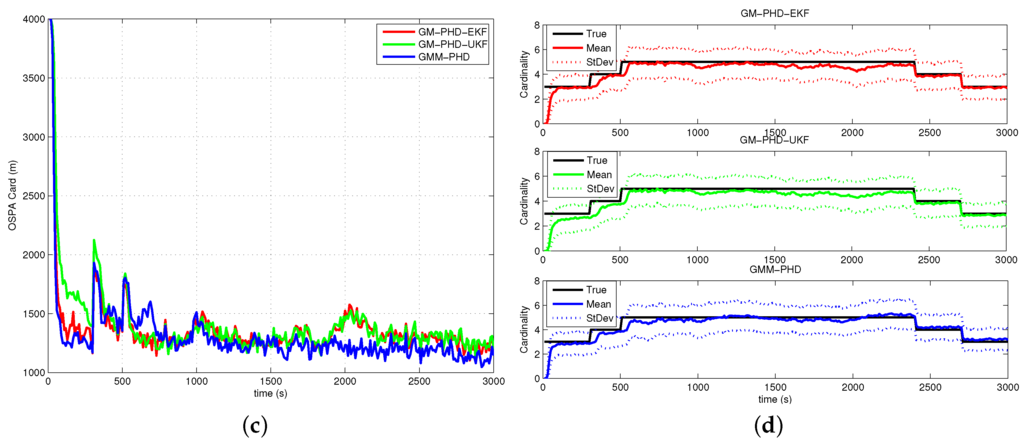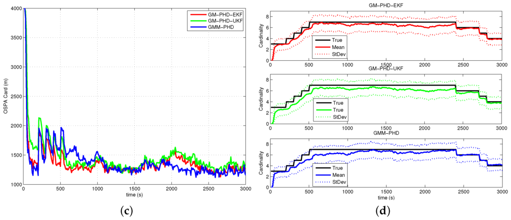 In Figure 5a, Figure 6a, Figure 7a and Figure 8a, the OSPA distance of the GM-PHD-UKF is slightly lower than that of the GM-PHD-EKF. The GMM-PHD performs significantly better than the other two filters. Before 1000 s, the target states are unobservable, and all of the filters have a large OSPA distance error. After the sensor maneuver, the target states become observable, and the OSPA distance decreases sharply. From 1500 s to 2500 s, the OSPA distances of all filters show a little bit of an increase as the measurements overlap, which makes it hard for the filters to estimate the target states.
