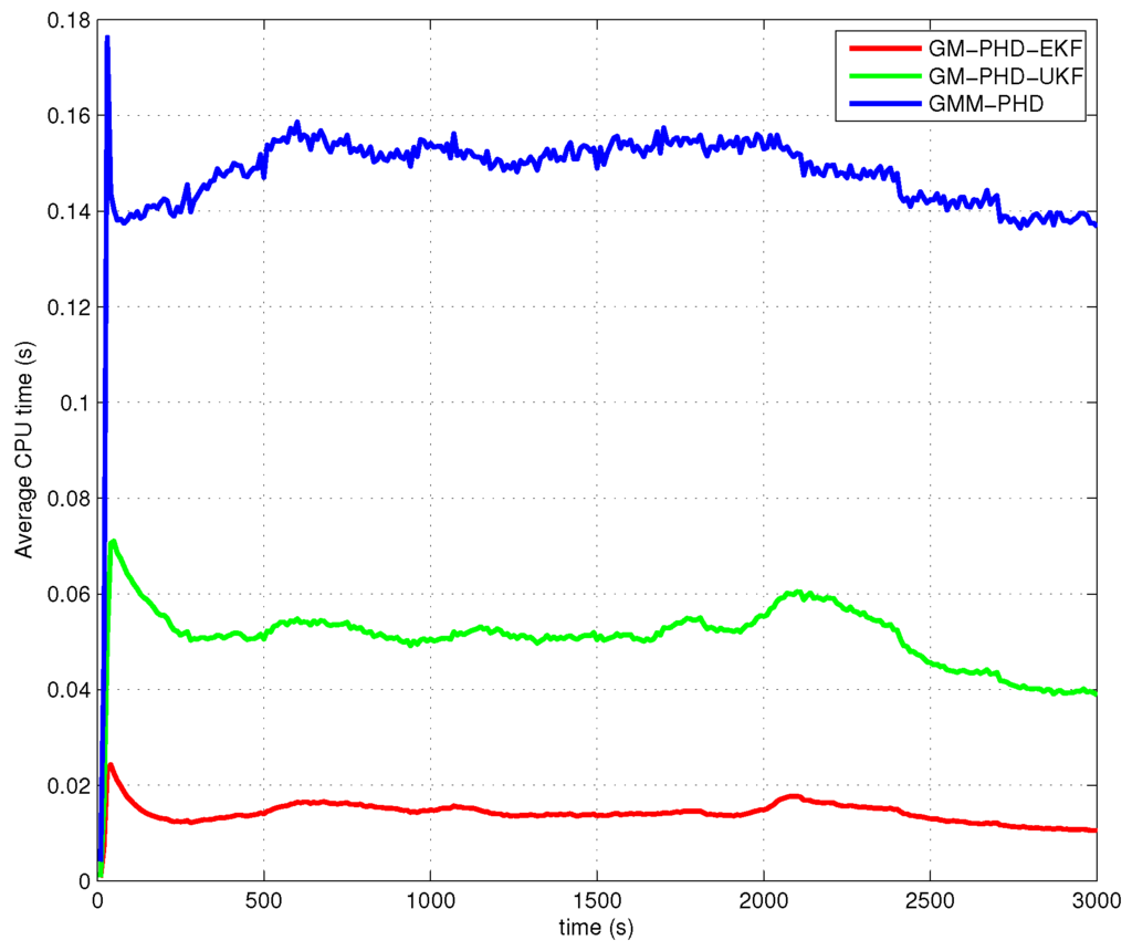 According to the discussion above, the improvement of the GMM-PHD is mainly reflected in increasing the tracking accuracy of the target states, but not the cardinality estimation of the targets, for Case 1, Case 3 and Case 4. When the simulation situation becomes worse (the clutter intensity becomes bigger, and the probability of target detection decreases) in Case 2, the GMM-PHD shows improvement on both the track accuracy and the cardinality estimate. As the measurement likelihood is approximated by a Gaussian mixture, the number of track components in the GMM-PHD filter is bigger than for the GM-PHD-EKF and the GM-PHD-UKF. The execution time of the GMM-PHD filter is slightly larger than the other two filters, as shown in Figure 9. However, the execution times of these filters are much smaller than the real time. Note that the computational load of each filter becomes heavier if the number of targets increases, as the maximum number should be set bigger to ensure good performances.