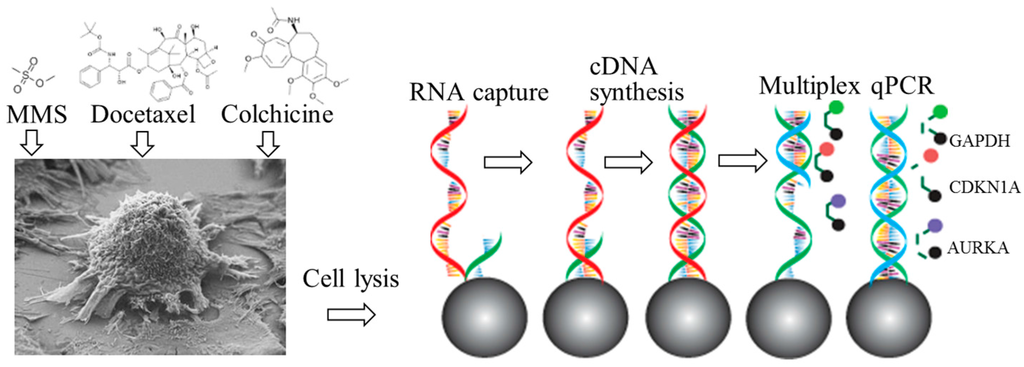 Furthermore, based on the hypothesis that gene expression profiles can be used to interpret mechanisms of genotoxicity [,], drug treatments were employed to study the dose-dependent and time-dependent patterns of gene expression. By treating human cancer cells with three drugs (MMS, TXT, and COL) at varied concentrations for different time lengths, GAPDH, CDKN1A, and AURKA genes were leveraged for assessing the genotoxicity at the single-cell level. All steps of single-cell isolation, immobilization and lysis, mRNA capture, cDNA synthesis, target gene amplification, and detection were fully integrated on the microchip. The cultured cells, the working principle, and the corresponding experimental setup are demonstrated in Figure 1.