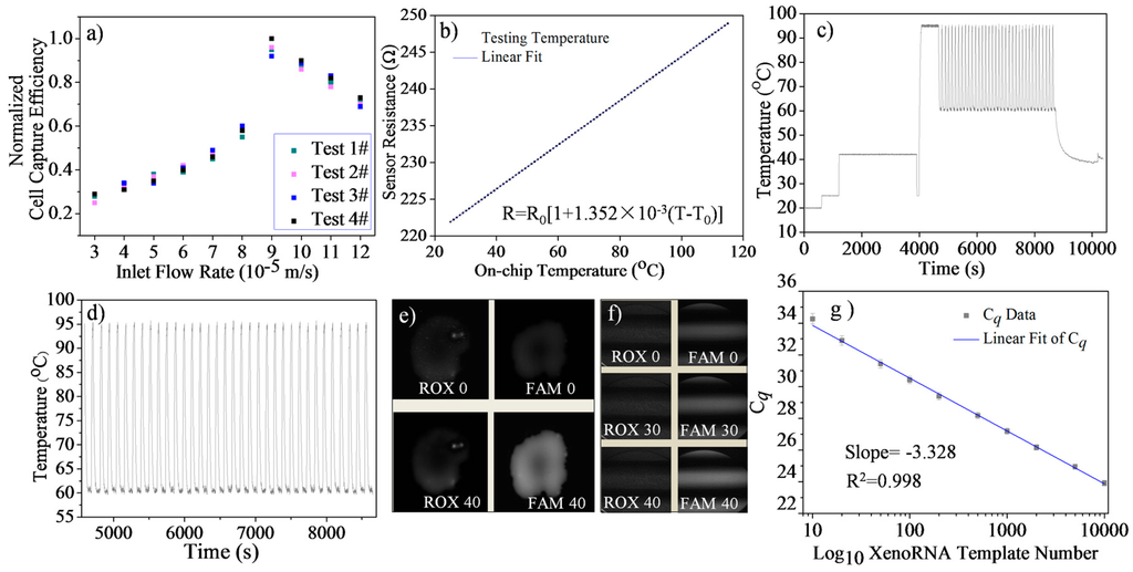 (a) Cell trapping efficiency with different inlet flow rate; (b) Temperature sensor calibration; (c) On-chip temperature control evaluation; (d) Detailed temperature history of a 35-cycle on-chip PCR; (e) On-chip RT-PCR validation; (f) On-chip RT-qPCR validation (‘0, 30, 40’ indicates cycle number); and (g) Standard curve of on-chip XenoRNA amplification.