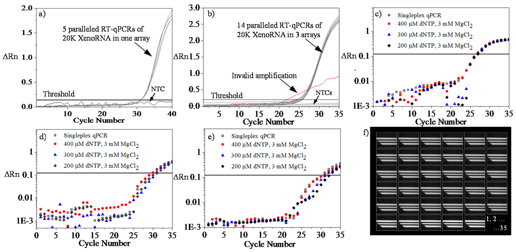 (a) Repeatability or intra-assay variation testing of microfluidic RT-qPCR (20,000 copies XenoRNA); (b) Reproducibility or inter-assay variation testing of microfluidic RT-qPCR; (c) On-chip PCR of GAPDH by singleplex or multiplex methods; (d) On-chip PCR of CDKN1A by singleplex or multiplex methods; (e) On-chip PCR of AURKA by singleplex or multiplex methods (square points mean the data by singleplex method while the circle, triangle and diamond symbols mean the data by multiplex tests); and (f) A fluorescent image set reflecting CDKN1A reporter intensity during a 35-cycle qPCR (Numbered as 1, 2, …, 35).