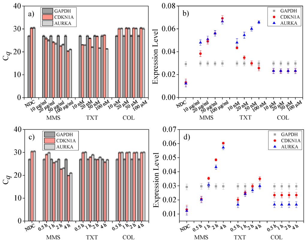 Finally, for AURKA, Cq values with MMS treating time increased from 0.5 to 4 h are shown in Figure 5c, and the corresponding expression levels increased with treating time length growing (Figure 5d). This trend can also be found in TXT testing. In the COL test, Cq values and expression levels were stable with varied treating time length.