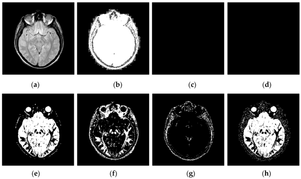 As discussed in [], the WLD can indicate the saliency of the local neighborhood very well because of its powerful representation ability for such important features as edges and textures. To explain this point better, Figure 5 shows the results of the WLD operating on the FMIs shown in Figure 4c,d,g,h. The comparisons between Figure 4 and Figure 5 show that both the strong and weak edges in Figure 4 have become more salient in the results of the WLD than in the FMIs. Therefore, the WLD operating on the FMIs can bring out the local image structural features of source images very well, which are highly beneficial for medical diagnosis based on different imaging modalities. It will be desirable to utilize these extracted salient image features to determine the similarity between and in the source images, i.e.,