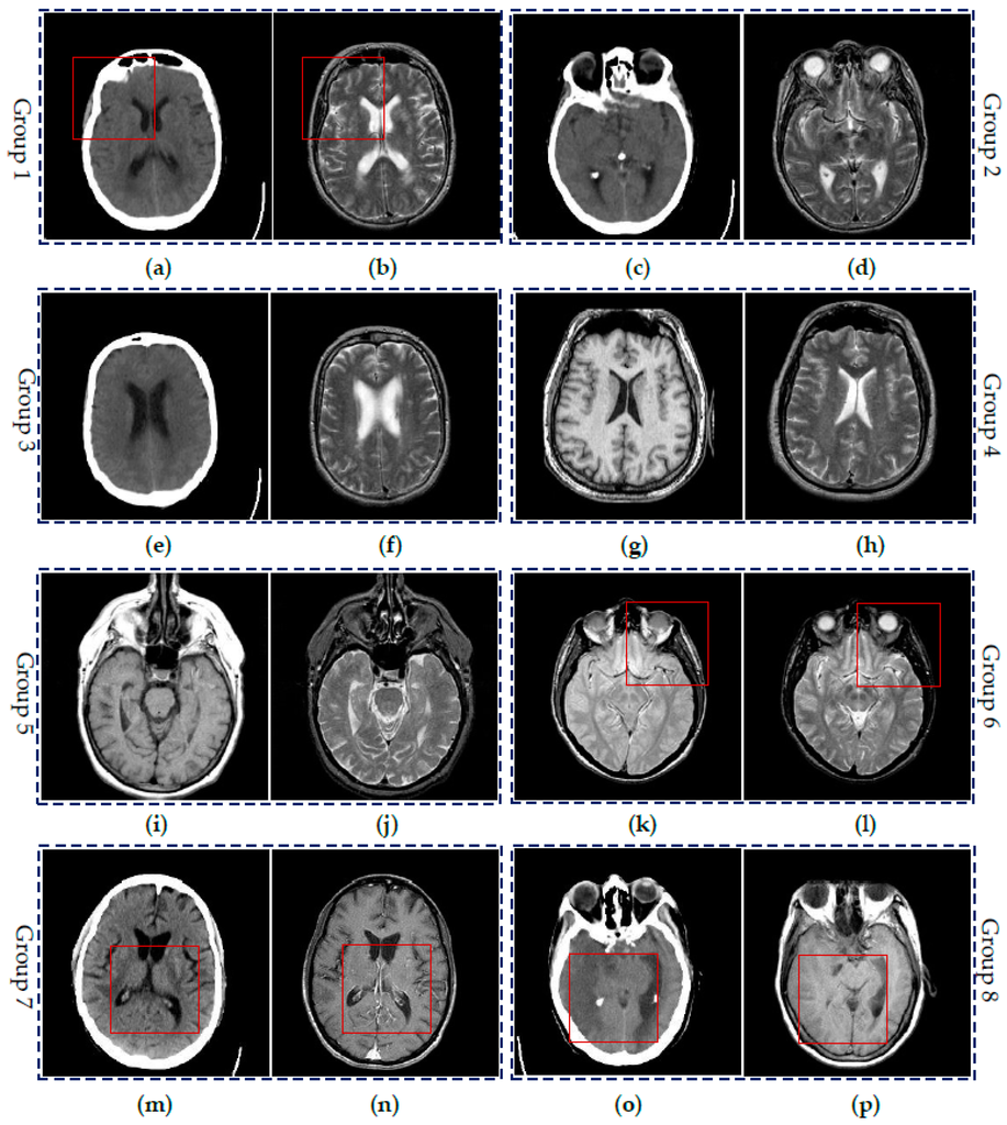 To demonstrate the effectiveness of the proposed SCM-M method, extensive experiments have been done on eight groups of CT and MR images shown in Figure 6. All the images are chosen from the website []. Each image is of size 256 × 256. Two images in each image pair include the complementary information. Here, Groups 1–3 are three pairs of CT and MR images of different regions in the brain of a patient with acute stroke. Group 4 includes the transaxial MR images of the normal brain. Groups 5 and 6 are MR images of the brain of patients with vascular dementia and AIDS dementia, respectively. Groups 7 and 8 are two pairs of CT and MR images of the brain of the patients with cerebral toxoplasmosis and fatal stroke. Please note that intensity standardization and inhomogeneity correction have been performed on all MR images by the above website.