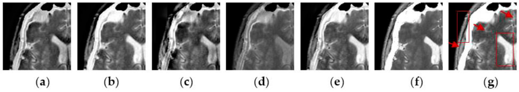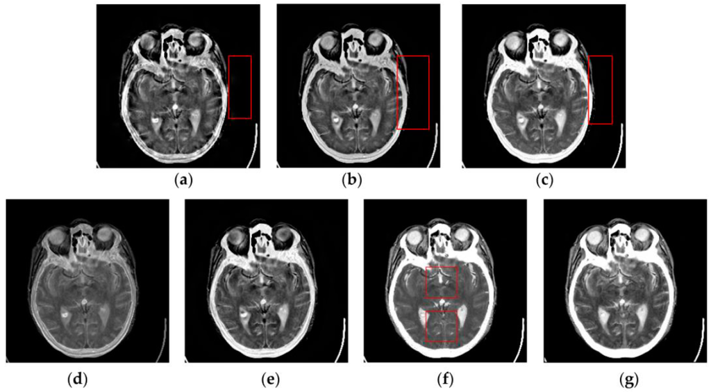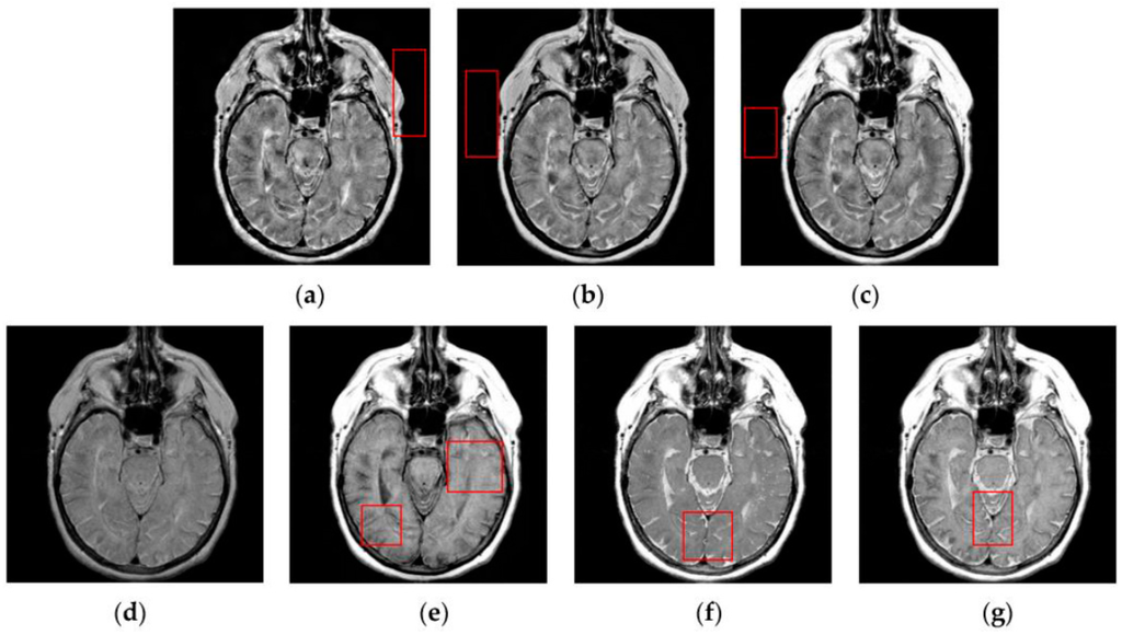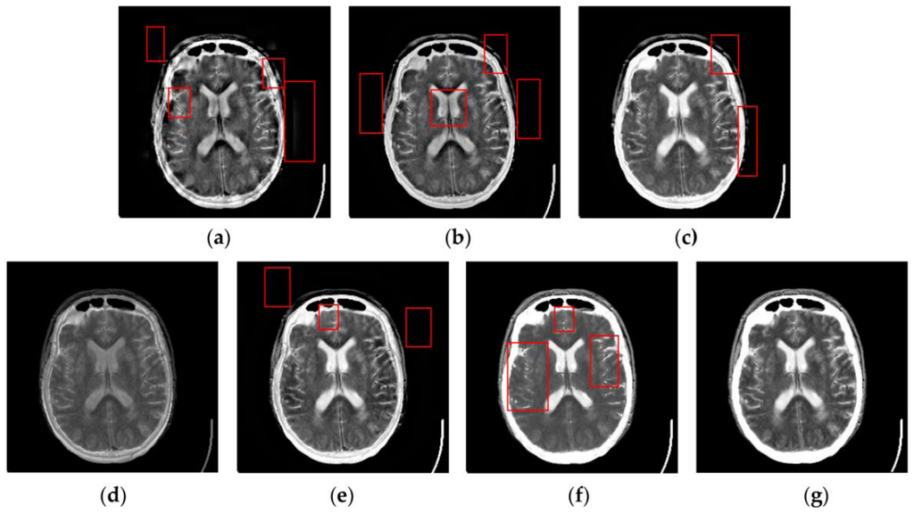 Figure 7, Figure 8, Figure 9 and Figure 10 show the fused results for the evaluated seven methods operating on such medical image pairs as Groups 1, 2, 4 and 5 shown in Figure 6, respectively. The observation from Figure 7, Figure 8 and Figure 10 shows that the DWT, NSCT and NSCT-SR methods introduce artifacts as well as false information in the fused results as indicated by the red boxes, which will greatly influence the quality of the fused images. Meanwhile, it is shown in Figure 7 and Figure 9 that the above three fusion methods cannot preserve image details well in that they produce the obvious distortion of image details marked by the red boxes in the fused results. The m-PCNN method cannot maintain the luminance of the fused results and it produces such low-contrast fused images that some important image details are difficult to identify, which is very disadvantageous for clinical diagnosis. The PCNN-NSCT method and the SCM-F method lead to loss of some important details in the source images to different extent. For example, for Groups 4 and 5, although almost all the details in the MR-T1 images can be transferred to the fused images by the PCNN-NSCT method very well, many details in the MR-T2 images have not been preserved by this method as indicated by the red boxes in the fused images shown in Figure 9e and Figure 10e. For Groups 1, 2, and 5, some image details have been seriously damaged by the SCM-F method as shown by the red boxes in Figure 7f, Figure 8f and Figure 10f.