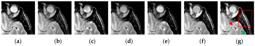 To further verify the advantage of the proposed SCM-M method in multimodal image fusion, Figure 11 and Figure 12 show the enlarged views of fused results for all evaluated methods operating on regions of interest (ROIs) denoted by the red boxes in Groups 1 and 6 in Figure 6, respectively. Figure 13 shows the enlarged views of fused results for the proposed method, the m-PCNN method and the SCM-F method operating on ROIs denoted by the red boxes in Groups 7 and 8 shown in Figure 6. In Figure 11 and Figure 12, we can see that the SCM-M method can maintain the salient information in the source images and provide better visual perception with less loss in luminance or contrast than other compared methods. To explain this point better, some edges and regions have been chosen from Figure 11g and Figure 12g. It can be seen from Figure 11 that the SCM-M method can provide better edge preservation than all other methods as pointed by the three red arrows. Meanwhile, compared with the DWT, NSCT and NSCT-SR methods, the SCM-M method can maintain the information in the MR image shown in Figure 6f better without introducing artifacts as indicated by the two red boxes. In Figure 12, we can see that the proposed method can keep the integrity of the edge marked by the red arrow best among all evaluated methods. Likewise, as pointed by the green arrow, the edge can be preserved very well by the proposed method while it has been damaged very seriously by other methods. Besides, the sharpness of the region shown by the red box can be maintained by the proposed method better than by the compared method. Furthermore, it can be seen in Figure 13 that compared with the m-PCNN and SCM-F methods, the SCM-M method can preserve fine image details and maintain image contrast better.