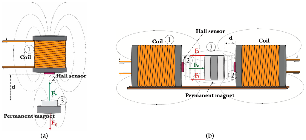 Figure 1 shows electromagnet— with driven current , linear Hall Effect sensor— and actuated body with permanent magnet—. Variable is the distance between the actuated body and the electromagnet. The following research will not be relayed directly on the specified structure (a) or (b) of the EMAwS depicted in Figure 1, but on the modelling of the magnetic force for the proximity measurement . The modelling of the magnetic force applied to the magnetic body is principally the same for systems (a) and (b) in Figure 1. For the electromagnetic force modelling and for further data fusion algorithm the state space description of the system is taken.