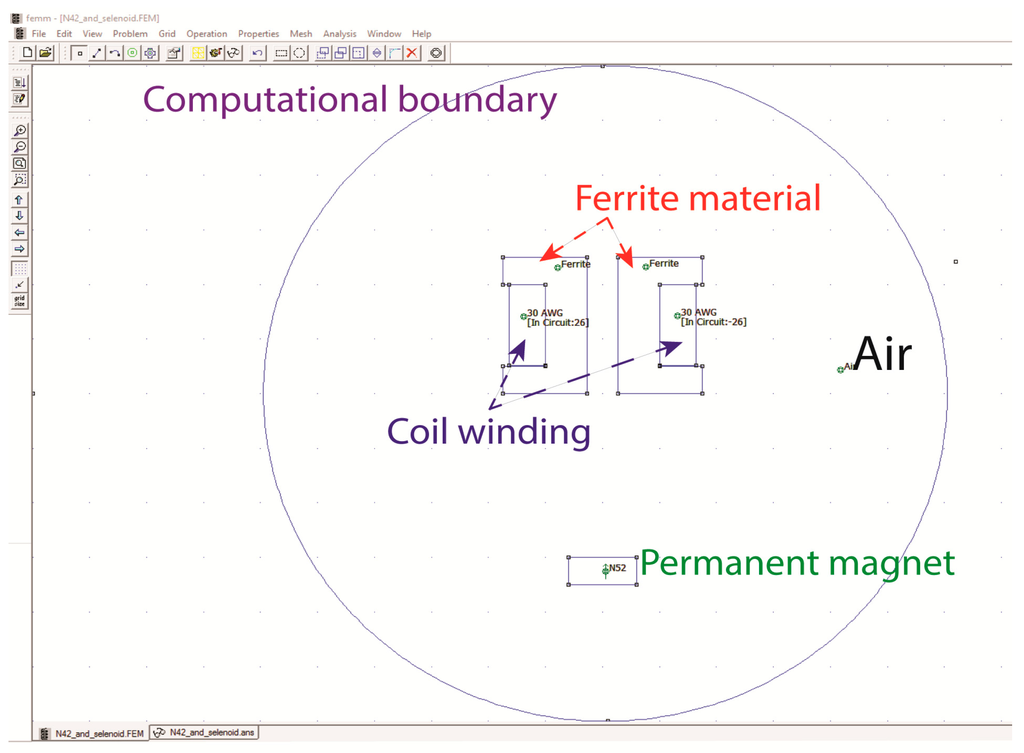 All the materials, wire characteristic, number of coil turns, driven current, PM characteristic were assigned in the FEMM software as depicted in Figure 3. The picture in Figure 3 represents a 2D-EMAwS model in central cross-section view, with computational boundary.
