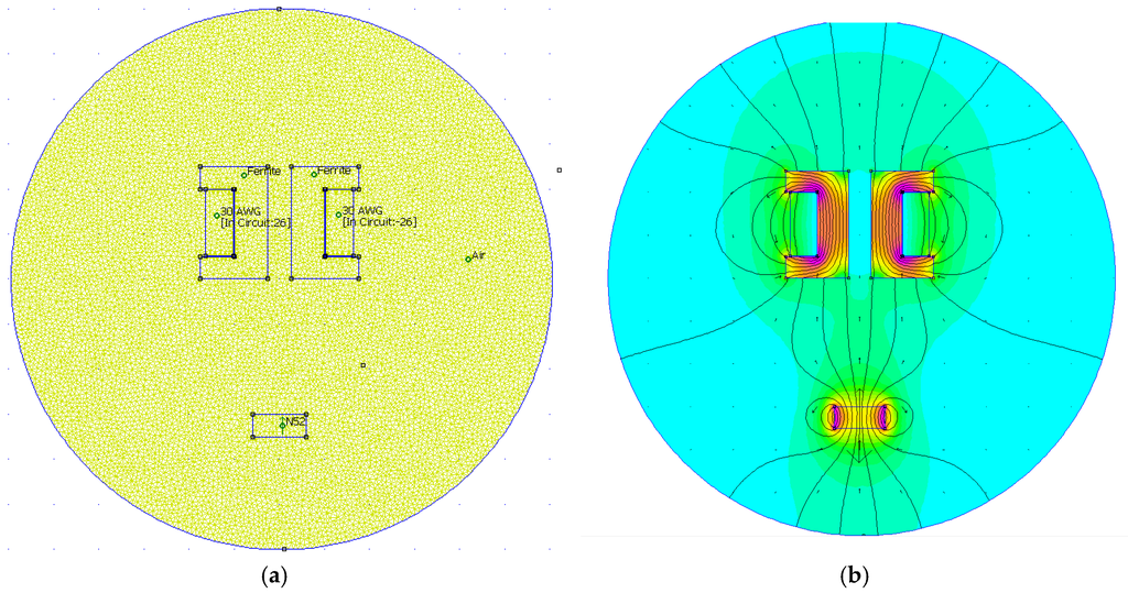 Finite element method with FEMM software for EMAwS. (a) Computational mesh; (b) Calculated values of magnetic force and field density.