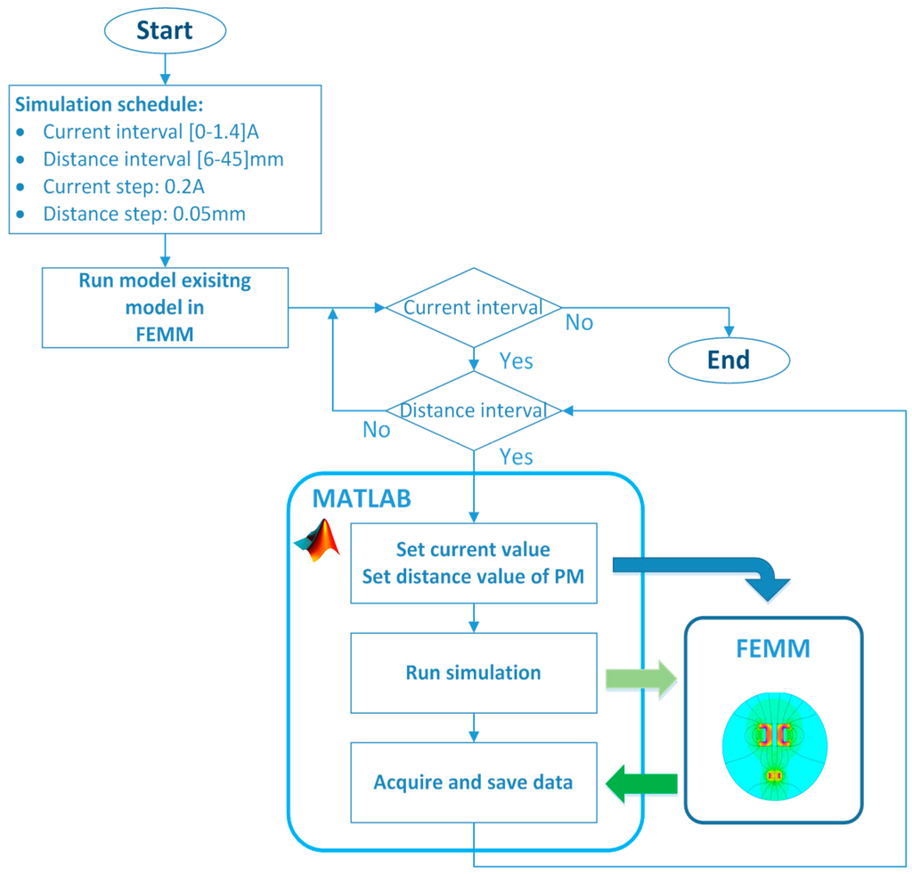 The coupling procedure is attained after designing a model in FEMM software with all the material characteristics. There were many choices for how to achieve and how to handle the objects inside the FEMM from outer programmes or self-defined scripts. As we mentioned before, the Matlab software was used to handle model objects externally in FEMM. Matlab-FEMM coupling has many possibilities for managing model objects and FEMM properties. The whole design of the model and simulation procedure inside the Matlab software was presented by Benamimour [36]. In our case, we used the possibility of simulation commissioning and model objects handling in an already existing FEMM model. The coupled Matlab software was used to control and acquire simulated data from FEMM. Matlab software scheduled the simulation parameters, where the driven coil current and vertical position of the PM were adjusted. The whole experiment was based on the measurement of the electromagnetic force, which was acquired from the FEMM at the exact specified value of the current and PM position. The current value was changed on interval by steps of , where position was changed on interval by steps of . The simulation schedule is depicted in Figure 5.