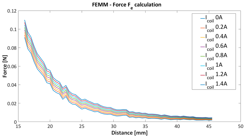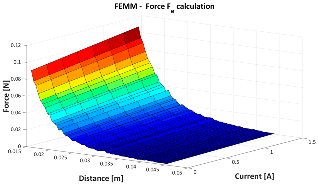 The FEMM software offers calculation of many different quantities and values of the designed electromechanical system. The electromagnetic force for the given system in Figure 4 was calculated via a weighted stress tensor, where the force value components were mapped in a 2D plane.