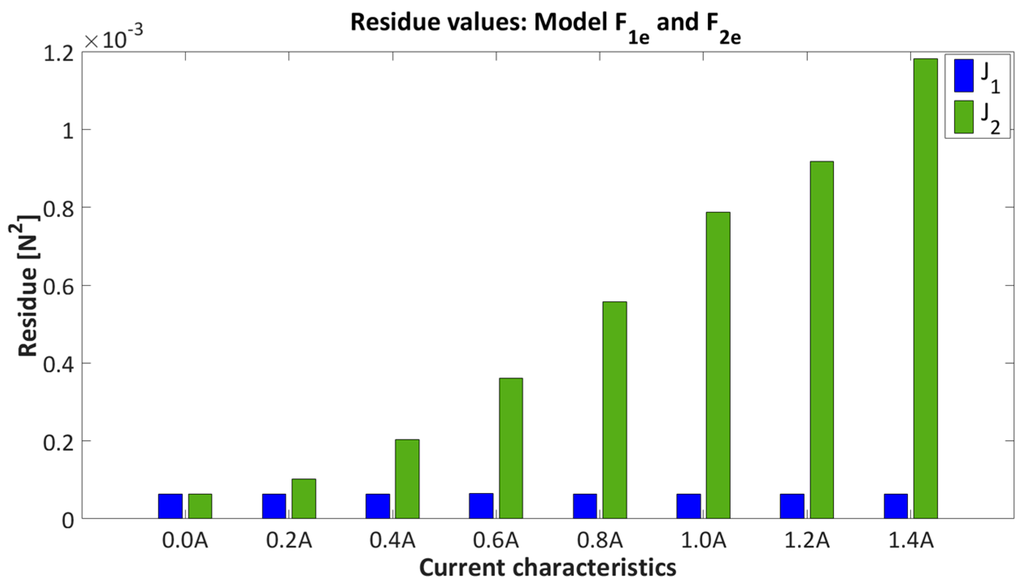The modelling of the electromagnetic force will be presented from the obtained simulation results from Matlab and FEMM software. The modelling of the electromagnetic has been based on the function fitting procedure to the set of the simulated result data’s with preselected model structure. Model estimation and data fitting was performed with the quadratic programming (QP) method. The QP technique is a well-known and efficient approach for convex optimization with introduced, boundaries, inequalities and equalities [37]. Before the objective function for optimization will be derived, the same optimization relaxation will be assigned. The modelling of the will be considered only on the system with fixed structure and geometrical form. The current and distance dependence by given fixed preselected system will be considered. From the simulated data presented in Figure 7 it is straightforward to recognise that the current dependence is completely linear to the force . This assumption can be proven with the calculated difference between each adjacent current’s characteristic in Figure 7. Each current characteristic has been labelled as , where represents corresponding current value from by steps of A. The linearity test of current to the is given with: