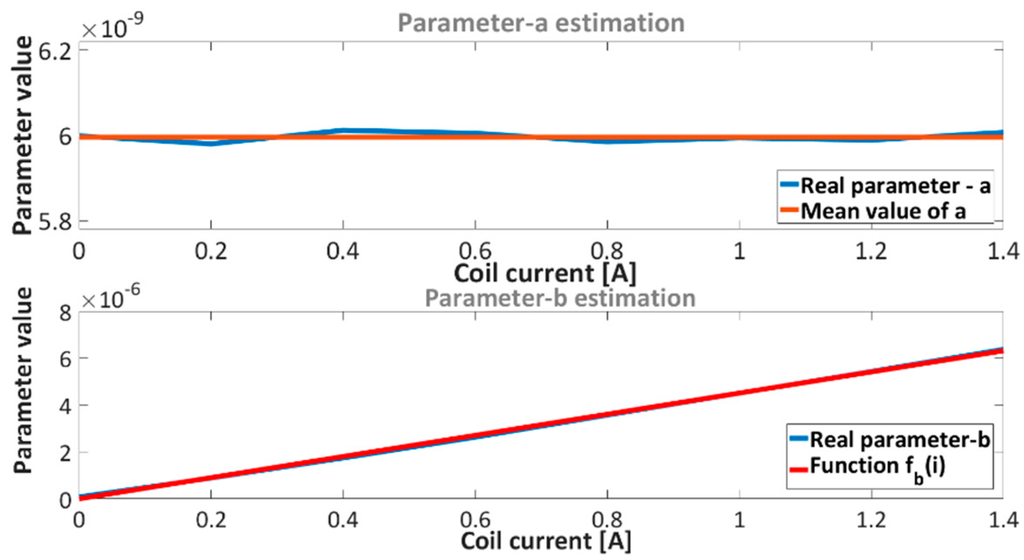 With regard to Figure 10 only parameter needs to be estimated, where parameter has a constant value with neglected deviation. The mean value of parameter is . Parameter can be approximate with linear function. Such function indicates linear dependence between force and current, which was confirmed before with Table 2. The selected linear function of parameter is: