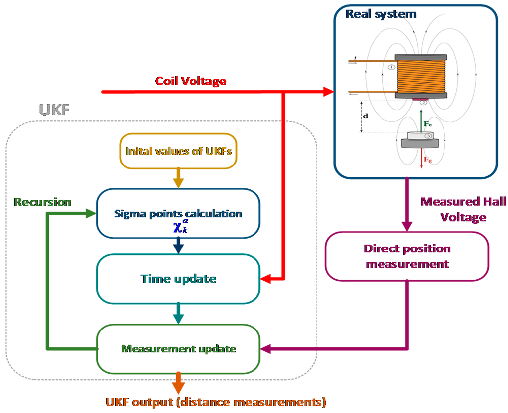 - Measurement Update Equationwhere variables , , , , , , , , , are prior sigma points states, prior output sigma points obtained from a nonlinear model given in Equation (17), prior estimated state vector, prior estimated output vector, process noise covariance matrix, measured noise covariance matrix, prior state covariance matrix, prior output covariance matrix, cross covariance matrix, Kalman gain, posterior state vector—UKF output and a posteriori state covariance matrix, respectively. The UKF algorithm starts with the a priori selected weights , and scaling parameters , . The UKF filter is used for the sensor fusion procedure in a manner to improve accuracy of the distance measurement with the Hall sensor. The direct measured value from the Hall sensor with Equation (14) represented variable , where is the estimated variable from the derived nonlinear model of Equations (2), (3) and (13).