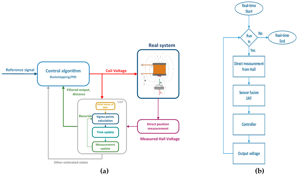 The sensor UKF fusion algorithm and nonlinear controller are running on an ARM Cortex-M4 STM32F407VGT6 microcontroller (STMicroelectronics, Geneva, Switzerland) with floating point unit-FPU and 12 bit AD conversion for accurate Hall voltage measurement. Figure 13 represents a real-time system configuration with a Hall proximity sensor and ARM microcontroller. The schematic in Figure 14 represents the structure of the sensor fusion algorithm with the feedback controller in Figure 14a and the algorithm procedure flow chart in Figure 14b.