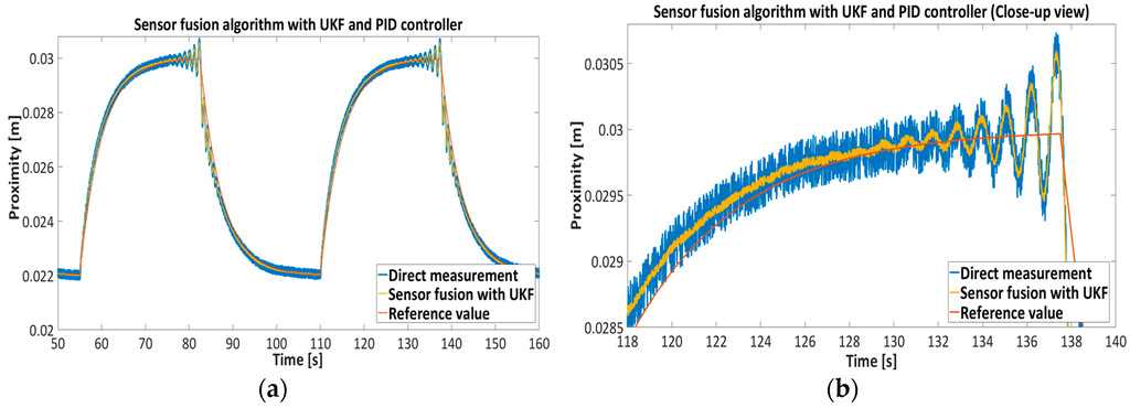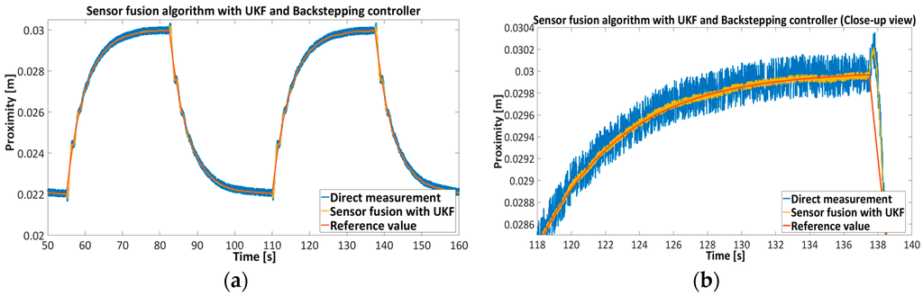 The results presented in Figure 15, Figure 16, Figure 17 and Figure 18 show the effectiveness and reliability of the sensor fusion algorithm with UKF. The UKF, in regard to the direct measurement application improves proximity measurements significantly, suppresses Hall drift and lowers noise influence on the proximity information signal. The effectiveness of the noise suppression is confirmed with the Frequency spectrum plot in Figure 17 and Figure 18 and with Table 6, where the RMS values of the signals are calculated. From Figure 19 it can be seen clearly that the UKF sensor fusion algorithm outperforms the EKF. The advantage of UKF can be noticed also in its reference tracking and noise suppression capability. The resolution of the measurement in regard to the feedback stability region between 18 mm and 32 mm is estimated at 0.05 mm with regard to Equations (14)–(16), Hall sensitivity value and 12 bit AD resolution of the ARM microcontroller. The accuracy of the proximity measurement in regard to the external ruler is estimated at 0.2 mm. At the end of the experiment it needs to be mentioned that the close-loop system in both configurations with backstepping and PID controllers are unstable if direct measurement from the Hall sensors is used in controller operation.